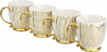 This four piece mug set will add a touch of elegance to your every day dining with its gold plated designs. This set of four mugs comes in assorted patterns, each mug featuring its own unique look. Made with fine ceramic material, these mugs are durable and meant to last. Featuring an ornate handle with a footed base and painted on gold plated patterns. Add some shine to your table and make every cup of tea feel a little more special with this set!