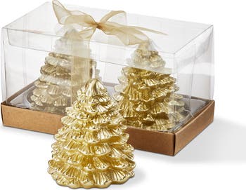 add a touch of elegance and sophistication to your holiday decor with this set of two gold fir tree candles. the candles feature a realistic-looking fir tree design in a shimmering gold color. they are made from high-quality paraffin wax and burn for approximately 6 hours each.