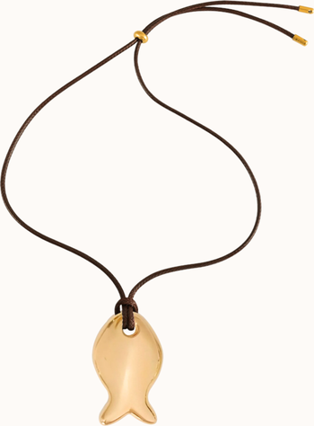 Fishie pendant paired with one of our waxed leather cords for an effortless look that feels styled but not overdone. Hardware on the cord is matched to the pendant so it flows perfectly — no extra steps or decisions needed.