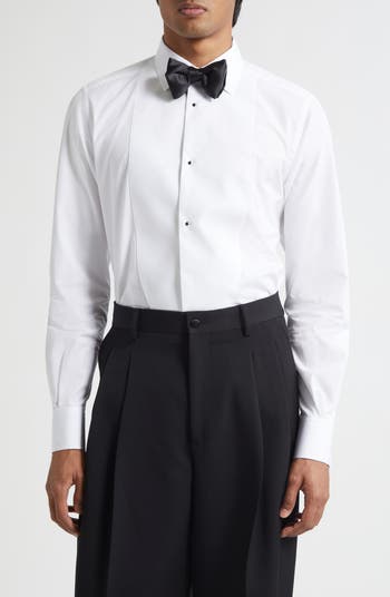 Cut from crisp Italian cotton poplin, this button-up draws a clean line with a tuxedo-style placket tipped in neat enamel buttons that read like miniature studs. A precise cutaway collar and lightweight drape keep the mood polished.