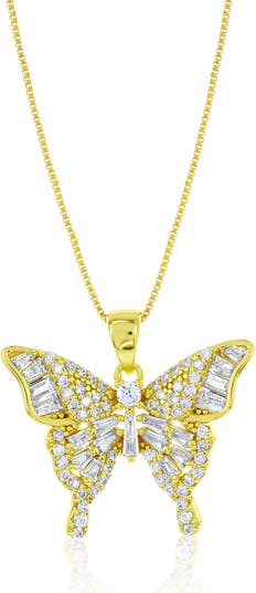 Add a touch of delicate beauty with the Gold-Flashed Crystal Butterfly Necklace. Made from 925 sterling silver and enriched with a luminous 14K gold flash plating, this 20-inch necklace features a butterfly pendant adorned with sparkling cubic zirconia stones. This elegant piece captures the grace and charm of nature, making it the perfect accessory to brighten any outfit and express your unique style effortlessly.