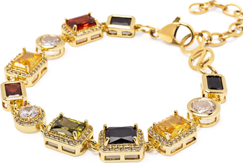 A striking fusion of contrast, color, and craftsmanship, this bracelet showcases handset stones including champagne-hued ovals, olive green smoky quartz, deep red garnets, and golden yellow citrine in bold rectangular cuts. Ruby, peridot, and black onyx are meticulously framed in secure bezels or classic four-prong settings and surrounded by shimmering AA-grade CZ stones. Crafted on a solid brass core with double-layered 18K gold plating, the piece delivers luminous depth and refined style.