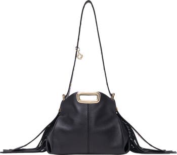 A true fashion statement, Maje unveils one of the timeless pieces in its collection: the Miss M. With a refreshing modernity, this model revisits the legendary codes of the M bag. It features the emblematic signatures: rectangular sheathed handles, delicate fringes and detailed topstitching. This version is enhanced by a detail that makes all the difference: its gold-tone metallic handles.Its long, adjustable strap, adorned with eyelets and large buckles, allows you to vary how you wear it as you wish: baguette-style for an assertive look, on the shoulder for a city vibe, or crossbody for a more practical touch.The Miss M is available in different materials and sizes to suit every style and occasion.