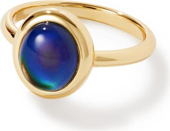 Feeling it? So is this gold mood ring. Plated in 14k gold, this mood ring is designed to shift colors with temperature changes while creating a one-of-a-kind experience for its wearer. While not scientifically reading emotions, over time the ring’s thermotropic crystals react to body heat revealing a range of beautiful hues unique to you. Style this gold mood ring with our Giulia hoops for a timeless look. To keep your ring glowing, avoid water exposure as moisture can affect the crystals and their color shifts. Be sure to remove your ring before washing, showering, or swimming to preserve it. • Plated in 14k gold • Features a color-changing mood stone • Comfortable for everyday wear
