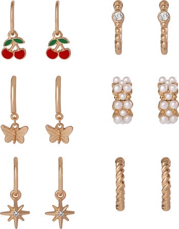 Build your ear-party in seconds. This curated set mixes gold-tone huggies and mini hoops with flirty cherry, butterfly and north-star charms plus pavé sparkle. Wear a matching pair or stack a mismatched, TikTok-worthy look—everyday glam made easy.
