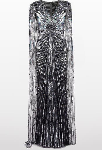 This gown emanates glamour and is adorned with an abundance of shimmering sequins that catch the light and create a radiant, multi-dimensional effect. The daring V-neckline adds a bold touch of allure, while the waist sculpts the figure into an exquisite hourglass shape. The flowing cape-like sleeves evoke a sense of grandeur, allowing the gown to move with an ethereal elegance. Its soft gold hue exudes timeless sophistication, making it the perfect choice for prestigious occasions, lavish soires, or star-studded events.