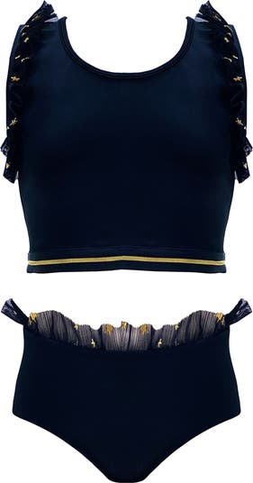Let her wish upon a star in this truly magical two-piece swim set. Crafted from a sophisticated, deep black fabric, this suit is designed for the little dreamer with a chic sense of style. The sporty crop top and matching high-waisted bottoms are adorned with delicate, sheer tulle ruffles at the shoulders and waist. Each ruffle is sprinkled with tiny, glittering gold stars, like a captured piece of the night sky. A sleek gold metallic stripe on the top's band adds a final touch of polished, understated glamour.