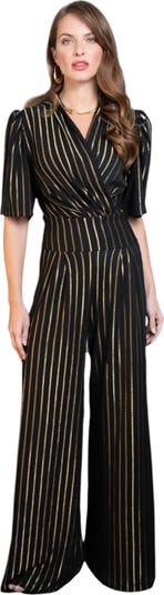 HotSquash London Wide Leg Jumpsuit, crafted in a delicate gold stripe fabric, adding elegance and glamour into your outfit. With a V style neckline, secured at the back of the neck with button fastenings and a keyhole detail. The wide waist band adds to the flattering fit. The tie belt design further sinches in the waist and the elbow length sleeve adds to the comfort and elegance of the style, making this a great alternative outfit option for an evening wedding. Due to the nature of the fabric on this style, please be careful when accessorising to avoid any damage to the jumpsuit.