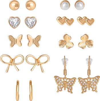 Pretty meets playful. This 12-pair assortment blends pearl-like studs, polished minis, bow motifs and butterfly drops for instant feminine flair. Dress them up or wear one pair at a time—your ear stack, your rules.