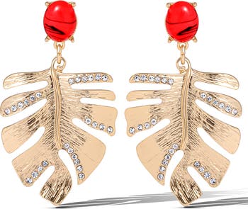 Embrace the bold and vibrant style of Jessica Simpson with these eye-catching Gold-Tone Tropical Leaf Drop Earrings. Featuring a beautiful tropical leaf design accented with sparkling crystals and a striking red stone at the top, these earrings add a perfect touch of glam to any outfit. Ideal for adding a touch of the exotic to your ensemble, these statement earrings are perfect for both day and evening wear.