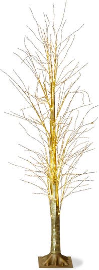 - 5Ft tall artificial pine tree made of plastic with a gold finish and 900 warm white LED lights measuring 16 inches in length and 16 inches in width.