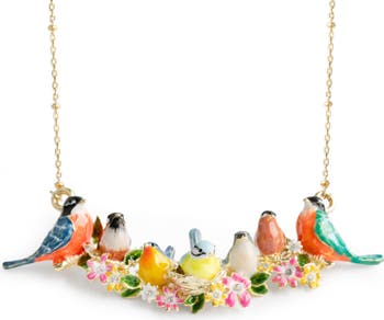 Inspired by the gentle harmony of birdsong, the Goldcrest Songbird Serenade Necklace captures a joyful gathering of songbirds perched together among hand-painted blossoms. Each tiny bird is thoughtfully detailed, creating a miniature garden scene that celebrates connection, warmth, and the beauty of nature coming together. A beautiful gift for Mother's Day.