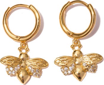 Pavé cubic zirconia highlight the organic sweetness of these whimsical honey bee hoop earrings plated in warm 18-karat gold.