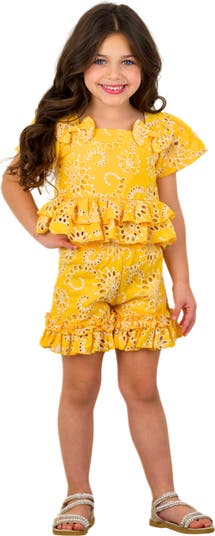 Golden Bloom Eyelet Puff Sleeve Top and Ruffle Girls Shorts Set