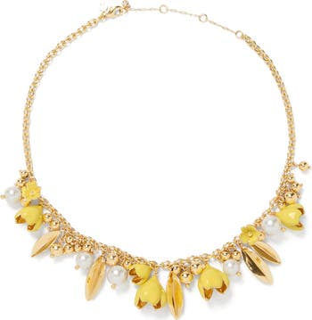 Gilded petals, bright buds and lustrous faux pearls cluster at the front of this statement-making necklace seeping with signature charm.