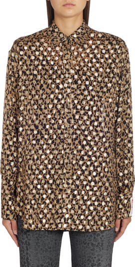 Golden fil coupé polka dots add dimensional shimmer to this leopard-print top that feels polished with a concealed placket and shirttail hem. Signature 'broken' star studs at the back yoke add an extra touch of metallic gleam.