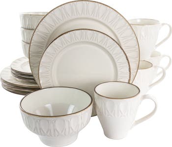 The Gibson Elite Golden Halo 16 Piece Stoneware Dinnerware Set brings an additional touch of elegance to the table. Featuring a fanciful embossed pattern on the edge of each with a gold like rim. It's a simple yet effectively luxurious design. The plates' off white color can be paired up with any table setup. The stoneware material allows the set to be cleaned within a dishwasher, and can be used to reheat food via microwave. These plates can be used for special nights or for the everyday meal.