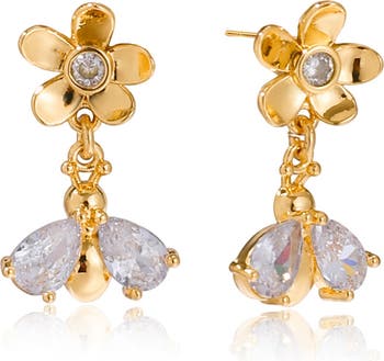 Sparkling cubic zirconia highlight the organic sweetness of these whimsical honey bee drop earrings plated in warm 18-karat gold.