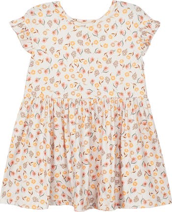 - This girls' dress is designed in a soft ivory hue, accented with delicate peach and golden botanical details. The flutter sleeves add a sweet touch, while the gathered waist creates a flowy, comfortable silhouette. Made from breathable fabric, this dress is perfect for effortless style and all-day comfort. Fabric Care 100% POLYESTER Machine Wash Cold