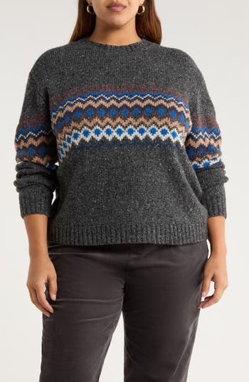 An appealing Fair Isle design centers a chunky crewneck knit from a soft merino-wool-rich mélange.