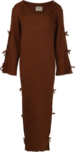 A statement piece that blends comfort and craftsmanship. This ribbed knit dress is designed with a flattering straight silhouette and delicate bow details along the sleeves and sides, adding a feminine touch to its minimalist shape. Crafted in a warm hue, it offers both texture and elegance perfect for transitioning from day to night with ease.