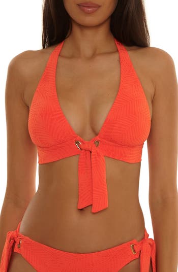 A tonal jacquard pattern lends dimension to this triangle bikini top made with a wide underbust band and adjustable ties.
