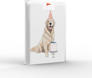This 8-pack of greeting cards is elegantly illustrated by artist Ingrid Ramus, founder and owner of the Ramus & Co brand. Artwork features a golden retriever wearing a party hat.. All greeting cards are made in the USA on heavyweight uncoated and locally-sourced and manufactured card stock. Each card is accompanied by a hand-embossed envelope made with heavyweight 95lb paper and a peel-and-stick flap - no licking envelopes here! All Ramus & Co. greeting cards are printed on FSC and SFI certified paper sourced from a regional mill that harnesses 66% of its energy from on-site sustainable sources, such as emission-free hydroelectricity and biomass co-generation from wood waste. All 8 greeting cards come packaged as a boxed set. Husband-and-wife team Calvin and Ingrid Ramus founded Ramus & Company in 2019, in New England, USA. Ingrid, the creative designer behind the brand, originates from Mexico, where she cultivated her skills in fashion and textile design. Drawing from her unique and inquisitive perspective on preppy style, Ingrid prolifically designs whimsical yet classic stationery and lifestyle items.