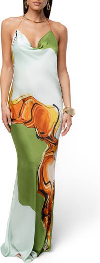 Slinky ties tether the open back of this figure-skimming maxi made with strategic skin-showing drapes.