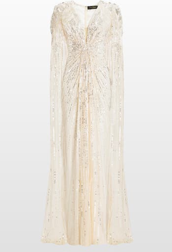 Meet the showstopping Goldfinger, a powerful gown that is striking from every angle. This dress is defined by its plunging neckline, fluid cape sleeves, and a silhouette that sculpts and elongates. Precision-placed sequins cascade vertically across the design, catching the light with every movement to create a sense of modern shimmer and flow. Soft gathering at the waist enhances shape and texture, while the overall look delivers effortless impact with a luminous finish.