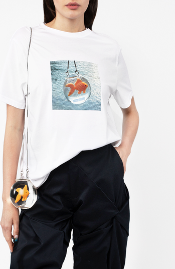 White Unisex Short Sleeve T-shirt in soft Pima Cotton Jersey. This classic crew neck tee has finely ribbed trim, and a straight-cut hem, featuring our iconic Kate Barton Goldfish Bag print. Made in NYC.