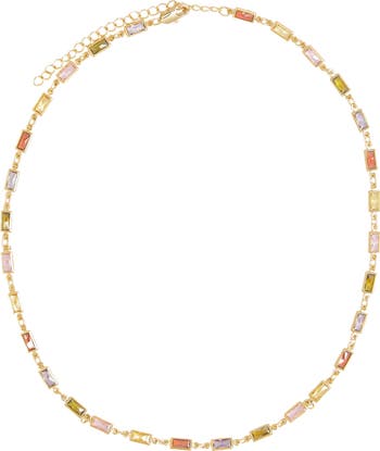 Colorful baguette-cut crystals gleam in bezel stations along this 18-karat gold-plated necklace.
