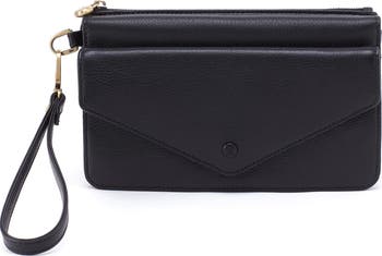 Brushed antique hardware highlights the grainy leather exterior of a slender wristlet packed with ample compartments perfect for securing your small on-the-go essentials.