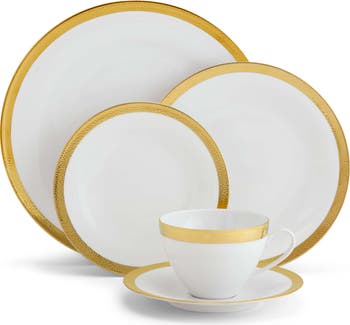 Organic textures inspired by ancient metal forging techniques accent a five-piece porcelain place setting that will add subtle opulence to your elegant tablescape.
