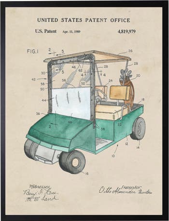 This vintage-inspired print, framed in a black wooden frame, features a golf cart patent. Sized at 16 inches by 20 inches, this made in the USA frame makes for a beautiful addition to any wall.