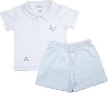 Our Golf Pima Short Play Set, made with heirloom quality Pima cotton, features hand embroidered detail for a comfortable and stylish look. Inspired by the love of this classic sport, this outfit is ideal for infant boys. Each oh so sweet, embroidered detail shows a meticulous attention to detail. The Golf Pima Short Play Set includes easy to pull up shorts and a shirt in white and light blue. Pima Cotton is easy to wash, and very comfortable to wear. Designed with a busy boy in mind, this set makes getting dressed in the morning a breeze.