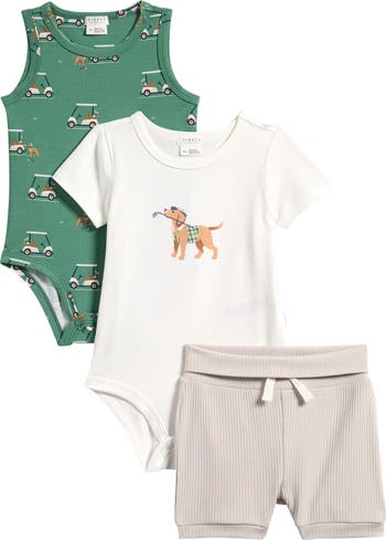 Your future golf-enthusiast will be ready for adventures on the green when wearing any or all of this adorable trio, mostly made from organic cotton and featuring a short-sleeve bodysuit, romper and ribbed shorts.
