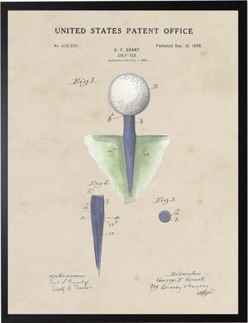 This vintage-inspired print, framed in a black wooden frame, features a golf tee patent. Sized at 16 inches by 20 inches, this made in the USA frame makes for a beautiful addition to any wall.