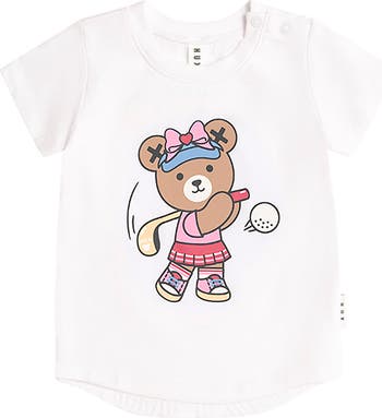 The perfect everyday tee, but with a sporty twist. This t-shirt is made from buttery-soft organic cotton in a crisp white hue and features a golfer Huxette embroidered on the tummy. Baby sizes feature stainless steel shoulder snaps for quick changes.