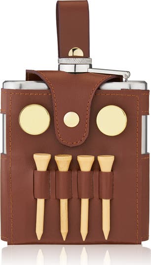 - Includes flask, 4 wooden golf tees, 2 ball markers, a divot tool, and carrying case Holds 6 oz Constructed from stainless steel and vegan leather carrying case Convenient carrying strap for portability Hand wash recommended