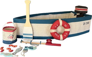 Spark your little one's imagination with this with this sea-worthy play boat set featuring a canvas boat with a plush motor, wooden oar and soft life preserver ring.