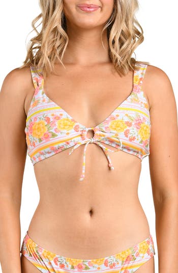 A tropical pattern brings lively texture to this vacay-ready bikini top featuring a center ring surrounded by cinched ties.