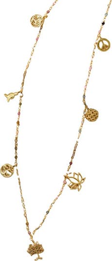 Embrace good fortune and positive energy with this amazing charm necklace! The delicate chain is adorned with tourmaline beads and features seven brass charms: Circle Mandala, Yoga Praying Figure, Ohm Symbol, Tree of Life, Lotus, Four Leaf Mandala, Peace Symbol. With adjustable links and a lobster claw closure, this necklace is easy to wear and the perfect way to put your good vibes on display! A Ten Thousand Villages Exclusive handcrafted in India.