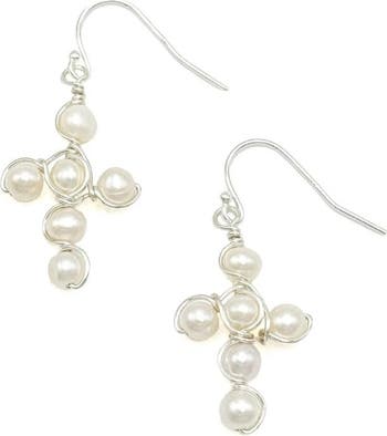 We love our Good New cross necklace and now our artisans have created 4mm freshwater pearl earrings in the same design! Swirls of silver plated wire fasten them to a sterling sliver fishhook. 1 5/8 inches total length.