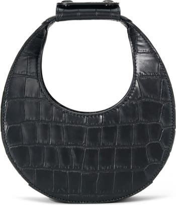 STAUD's iconic bag in a structured silhouette of croc-embossed leather features a '70s-inspired circular shape that resembles a crescent moon.