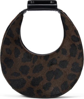 STAUD's iconic bag in a structured silhouette of leopard-print calf hair features a '70s-inspired circular shape that resembles a crescent moon.