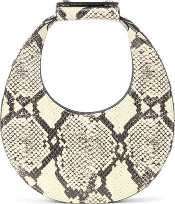 STAUD's iconic bag in a structured silhouette features a '70s-inspired circular shape that resembles a crescent moon. A wrapped carry handle and removable crossbody strap provide versatile styling options.