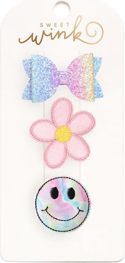 - This clip set includes: 1 multicolor glitter bow hair clip, 1 pink and yellow daisy hair clip, 1 tie dye smiley hair clip.