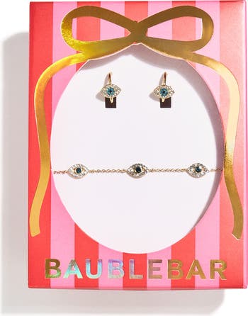 Packaged for gifting, this pretty set includes crystal-embellished hoop earrings and a delicate station bracelet, all styled with evil-eye charms to ward off negative energy.