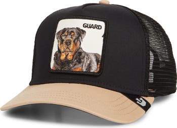 An embroidered patch fronts a classic trucker hat constructed with mesh paneling at the sides and back.