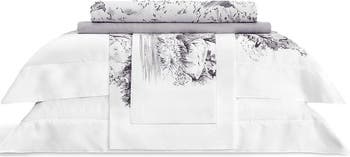 - The duvet cover is decorated with monochrome Toile de Jouy ornament.